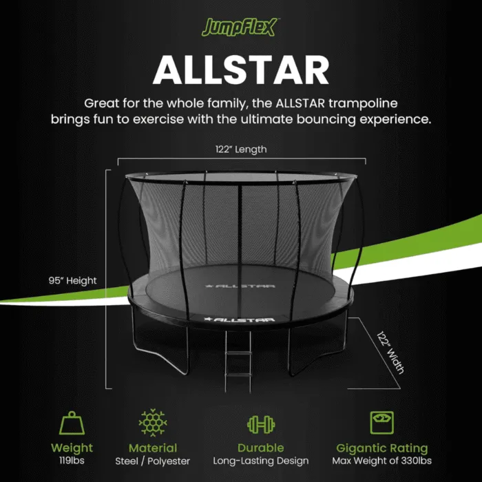 Bring exhilarating jumps, smooth landings, and lasting memories to your backyard with the ALLSTAR 10-Foot Trampoline—where safety meets excitement in every bounce!
