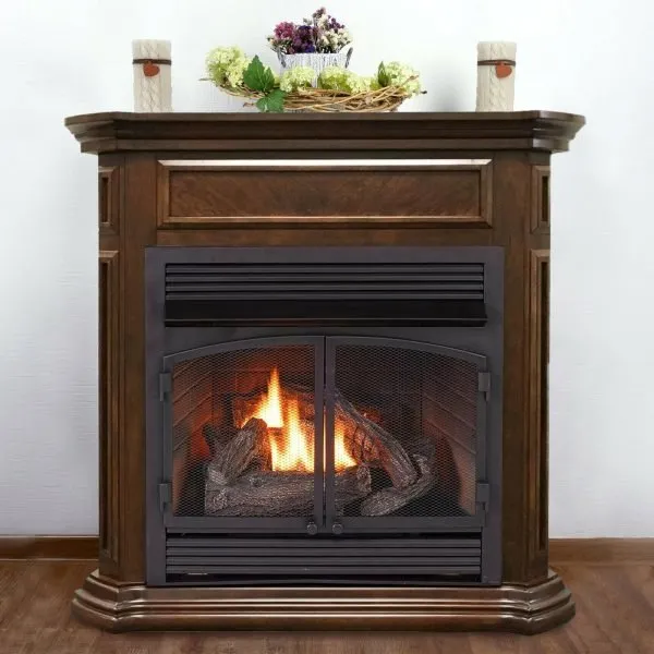 Duluth Forge Dual Fuel Ventless Gas Fireplace With Mantel – 32,000 BTU, T-Stat Control, Nutmeg Finish – Model# DFS-400T-4NG