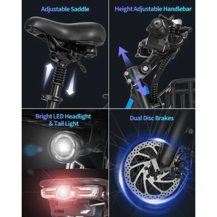 • Enhanced Lighting: Front and rear LED lights offer excellent visibility during night rides, while integrated safety features add peace of mind.