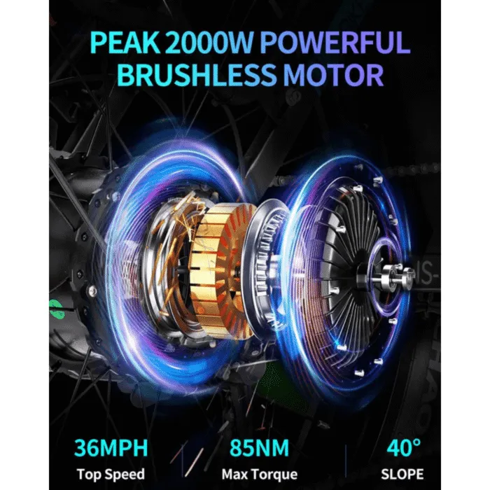 • Powerful 2000W Motor: Conquer demanding terrains with a high-torque motor that makes steep slopes (up to 45°) and rough trails feel effortless.