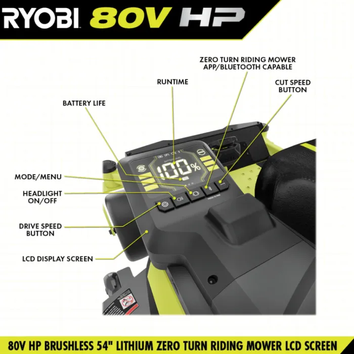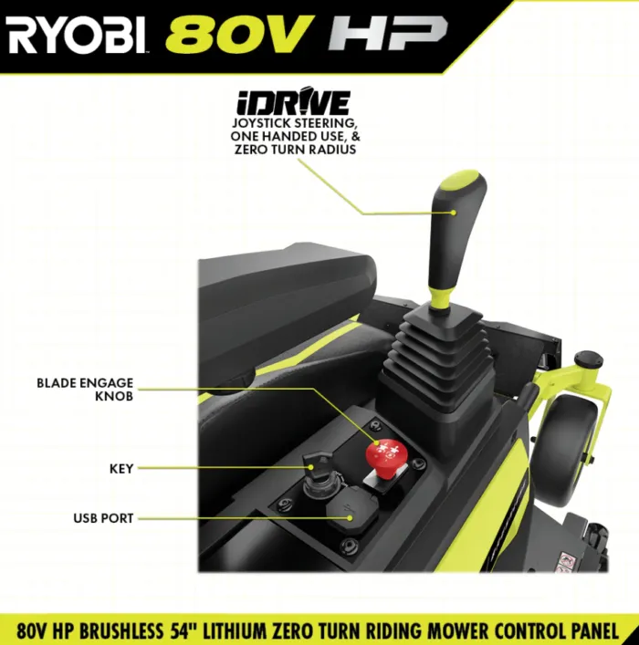 Introducing RYOBI’s first lithium-ion battery powered zero turn riding mower, the RYOBI 80V HP 54″ Lithium Electric ZTR*. HP Technology and 80V batteries combine to deliver the power equivalent of a 42 horsepower gas engine*, while eliminating the hassle and maintenance of a gas mower. This rider cuts up to 4 acres per charge with the help of 5 brushless motors, (3) 80V 10Ah batteries, and (4) 40V 12Ah batteries, with a Hyper Charger that fully recharges in 5 hours so you’re ready for your next job. The revolutionary iDrive system uses an intuitive one-handed joystick steering to maneuver around objects more easily than a traditional ZTR. The innovative LCD screen displays runtime, battery life, and cut/drive speed while in use, while the Riding Mower app allows you to monitor charge time and battery life remotely. This riding mower features the CROSS CUT multi blade system, providing superior cutting & mulching performance, while the 12-point height adjustment allows you to select the perfect cutting height between 1.5″ and 4.5″. The rubber side discharge chute makes it easy to maneuver around landscaping so users are not restricted by where they can cut. Designed with comfort and convenience in mind, this mower features premium seat suspension, 2 USB ports to charge phones, a storage compartment, and LED headlights. Mobile Service available in select regions. If your riding mower requires attention, a certified RYOBI support technician can diagnose & service right from your home. Some services may require you to bring your mower to one of the 300+ service centers nationwide. Lawn maintenance will never be the same thanks to the RYOBI 80V HP Brushless 54″ Lithium Electric Zero Turn Riding Mower.
