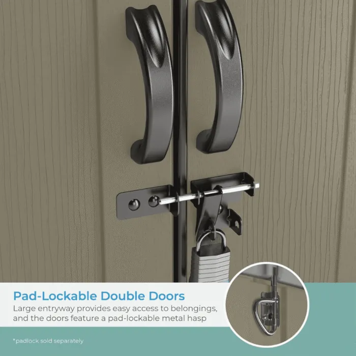 - Secure & Easy Access Double DoorsLockable double doors provide secure storage (padlock not included).Wide entry for easy access, perfect for larger tools and outdoor equipment.